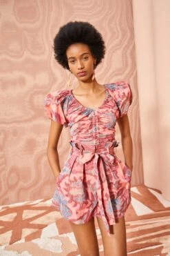 The Abri Shorts are crafted in our warp printed floral taffeta, showcasing an antique floral motif pattern that features faded pink and blue tones. These open-leg shorts are designed to sit at the high waist and are finished with a single pleat, side pockets, and a removable matching belt.