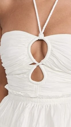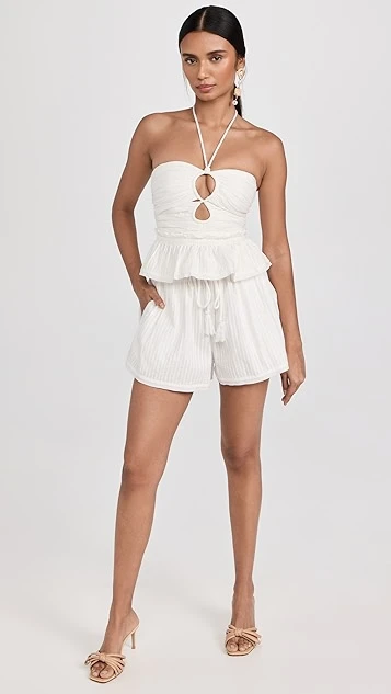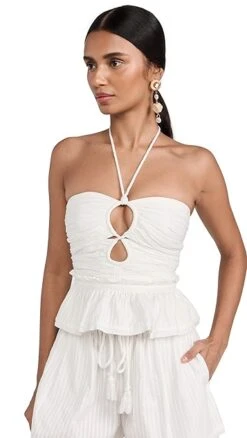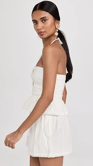 An Ulla Johnson halter top in bright-white fabric, perfectly suited for sunny days both at the shore and in the city. The label’s signature teardrop cutouts accent the ruched bodice of this piece, and a subtle peplum keeps the hem relaxed. Stay coordinated by completing your outfit with the brand’s matching shorts.