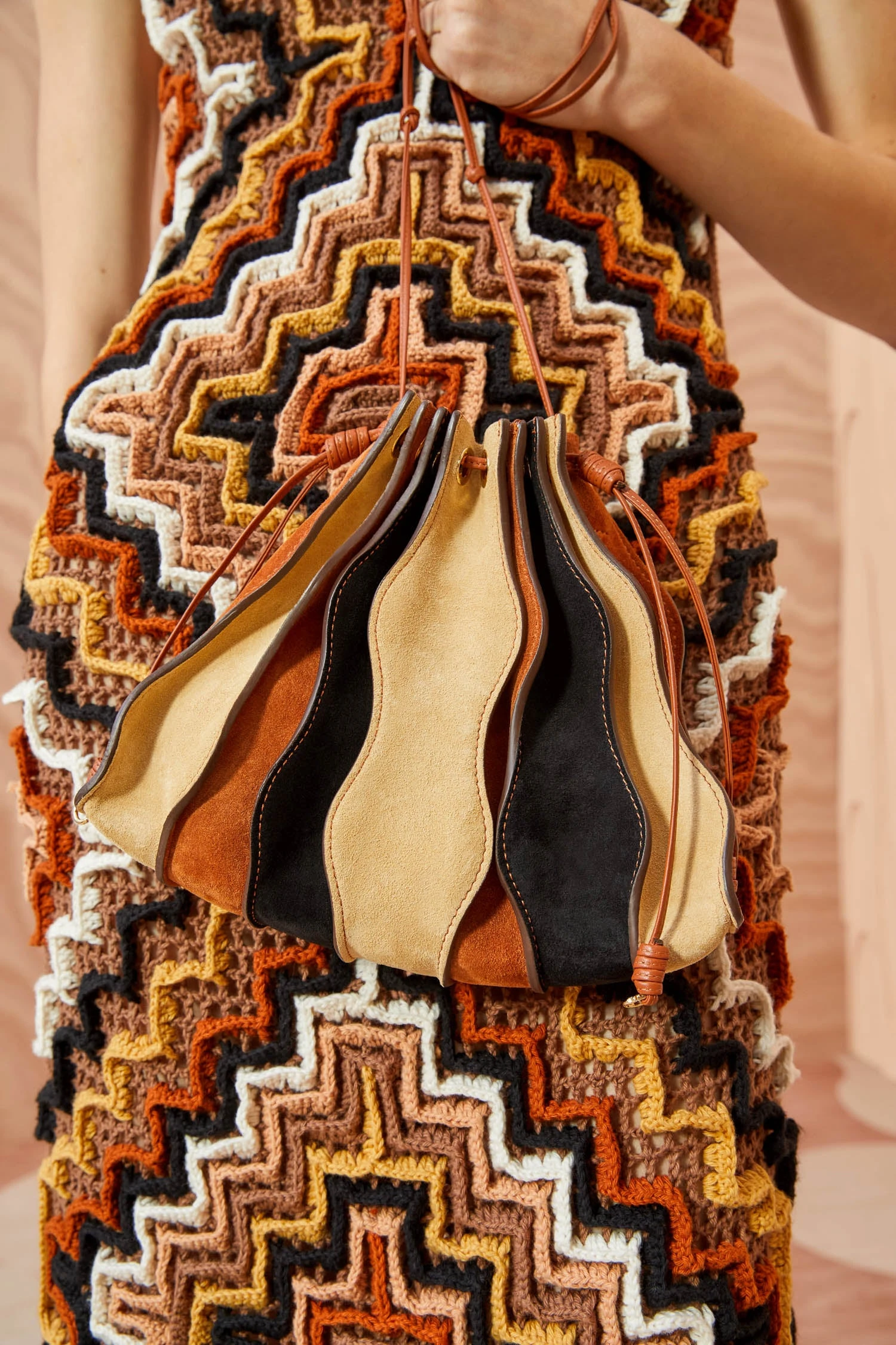 The Adria Small Pleated Wave Bag is a gorgeous new addition to our handbag collection, defined by undulating seams that adorn its sumptuous suede exterior. This beige, brown, and black crossbody bag features a drawstring opening and is finished with antique brass detailing.