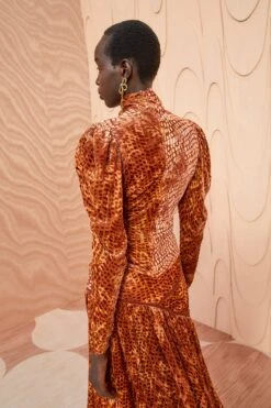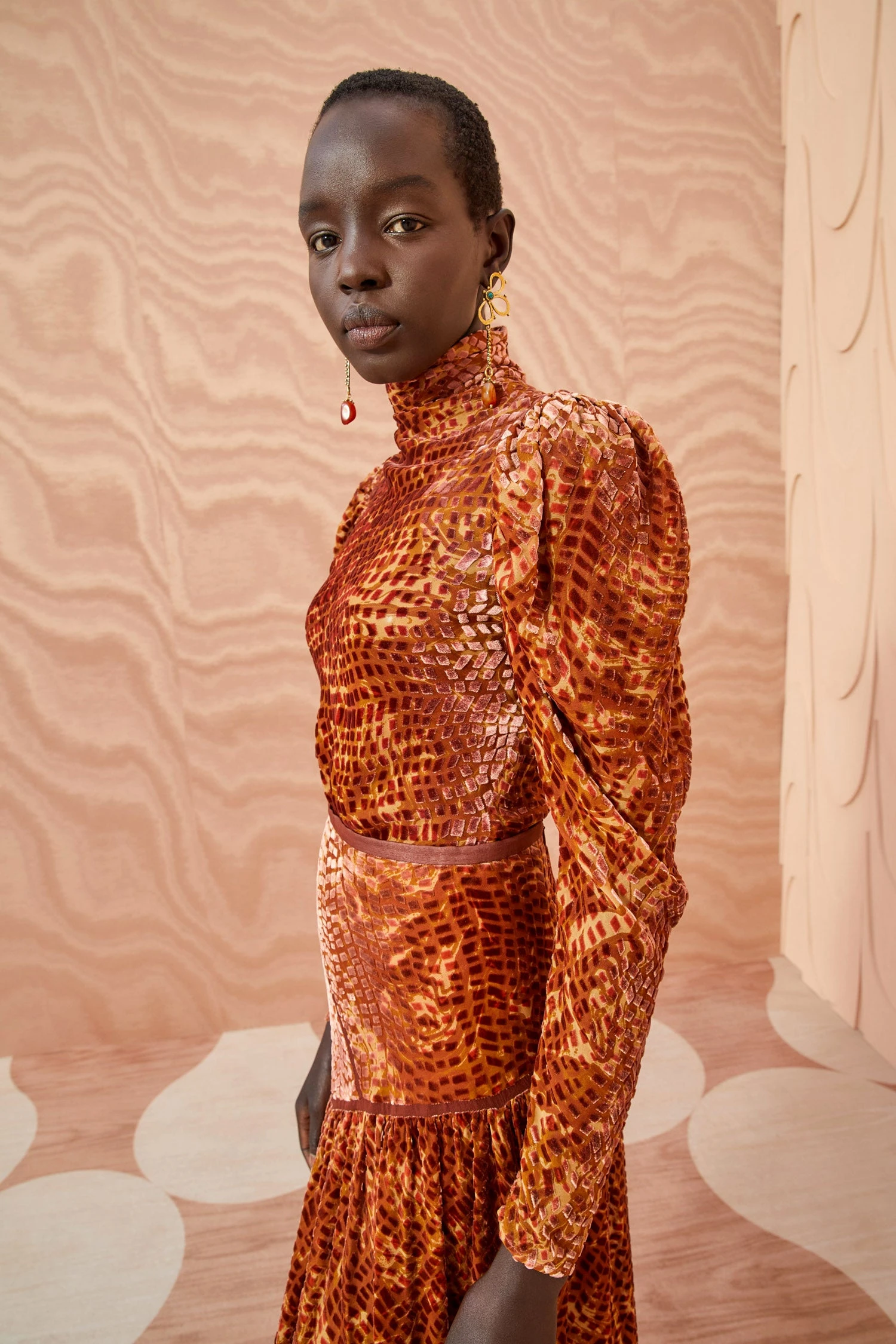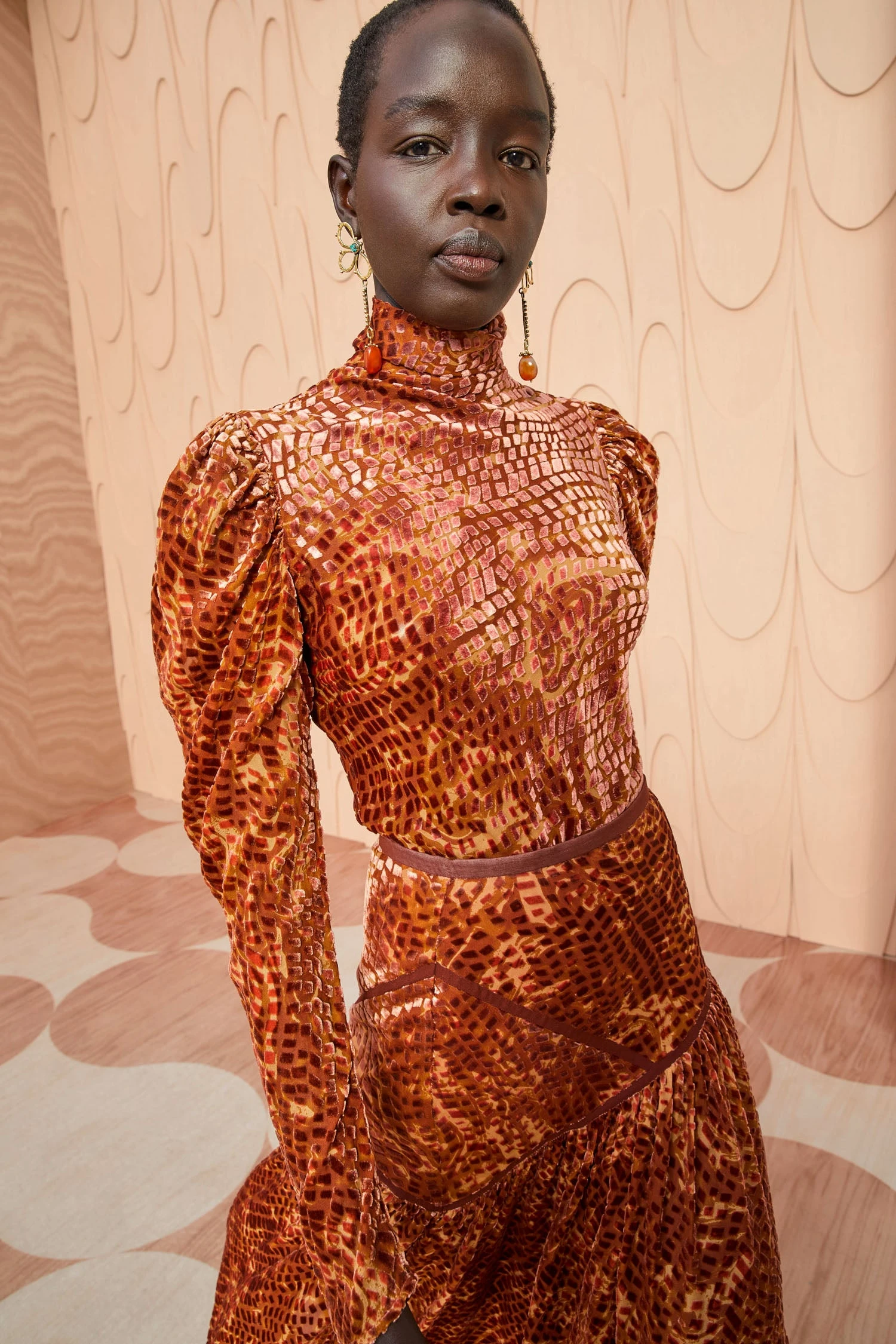 The Althea Turtleneck is crafted from our sumptuous velvet burnout fabrication featuring a swirling moiré motif. Framed by our signature puff sleeves, this sienna brown top features an elegant high neck and fastens with a hidden center-back zipper.
