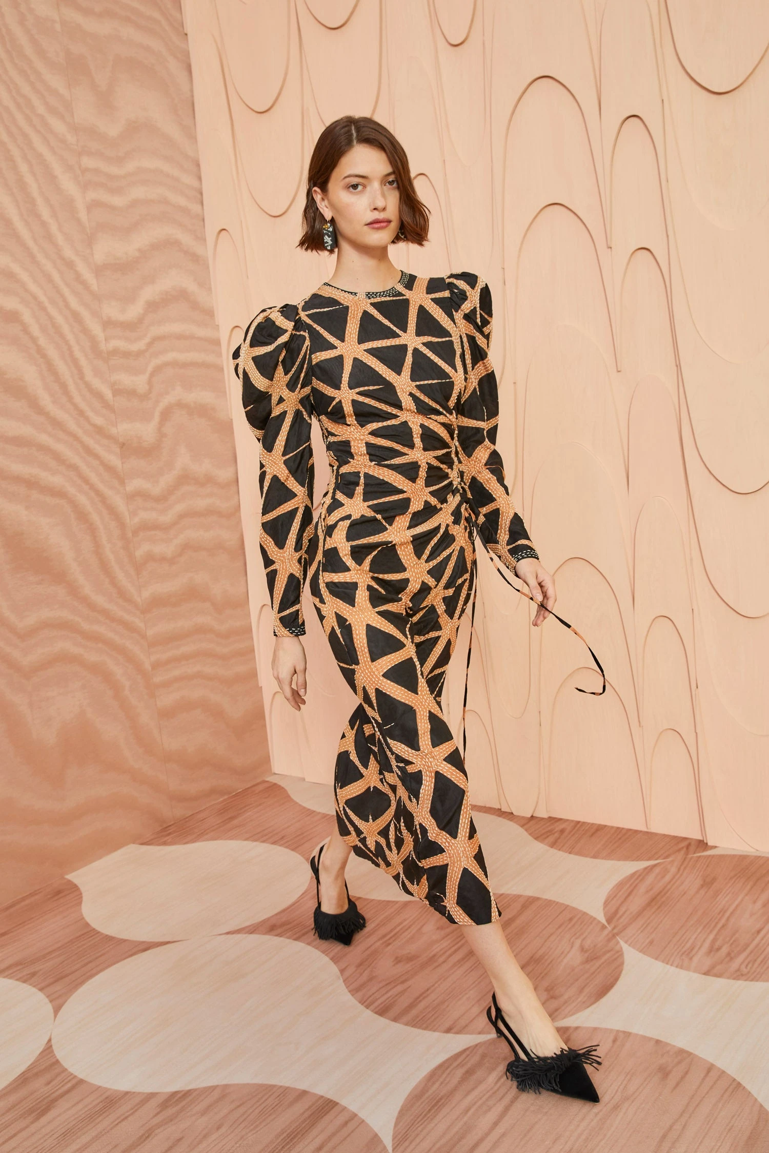 As featured on Ulla during our Autumn/Winter ’23 Runway Show, the Amalie Dress is made in our hand-dyed, hand-embroidered silk which is a continuation with artisans from Bangalore, India. This entirely hand-made process of dyeing is accented by hand embroidery in contrast stitching to create additional pattern and texture. This dress features full, draped sleeves and an asymmetric ruched seam down the front to create a body-skimming silhouette. It is finished with a side-seam zipper closure.