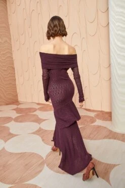 As featured in Look 7 of our Autumn/Winter ’23 Runway Show, the Ambrosia Dress is made from dark red ultrafine merino wool that’s been knitted in delicate open pointelle switches. Off the shoulder and close to the body, this gossamer knit is both alluring and refined, finished with signature ruffles falling asymmetrically across the skirt.