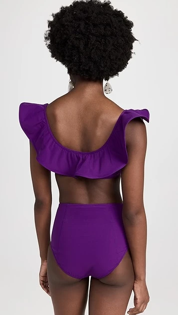 Pretty yet understated, this charming Ulla Johnson bikini top is imbued with dark-purple color and accented with wavy ruffles.