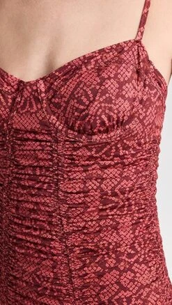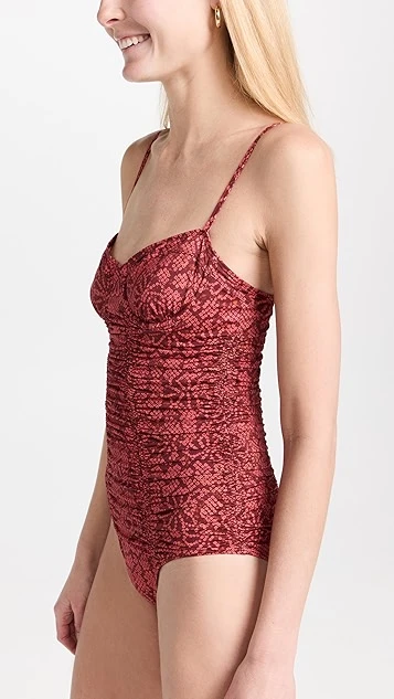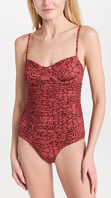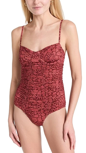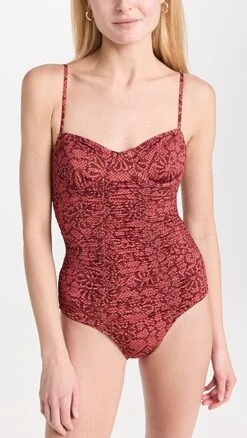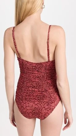 A stylish Ulla Johnson one-piece swimsuit, featuring ruching throughout the silhouette, an elaborate pattern, and a rich shade of red.