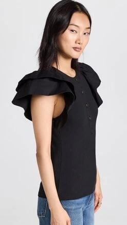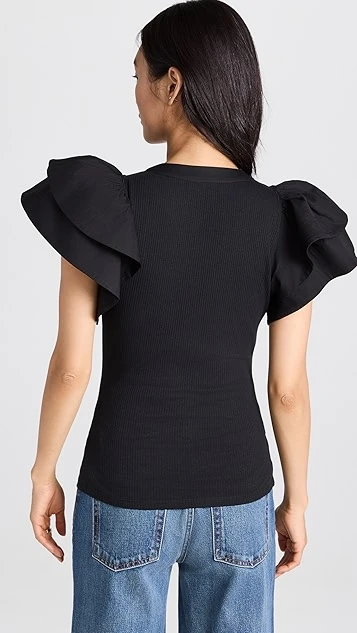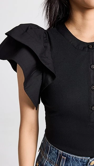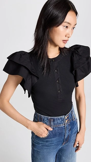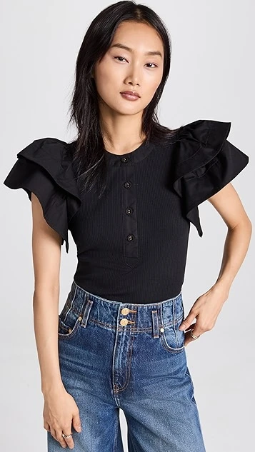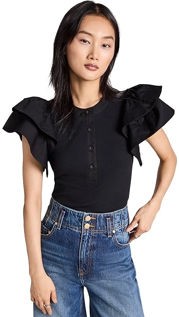 An everyday-friendly basic gets a romantic and eye-catching makeover. This Ulla Johnson Bonnie top features a ribbed-jersey body and henley-style neckline, as well as structured ruffles in tonal poplin at the shoulders. Tuck this piece into high-rise jeans to complete your outfit.