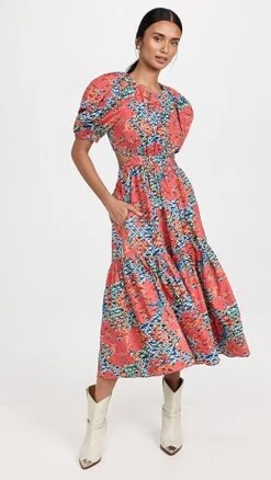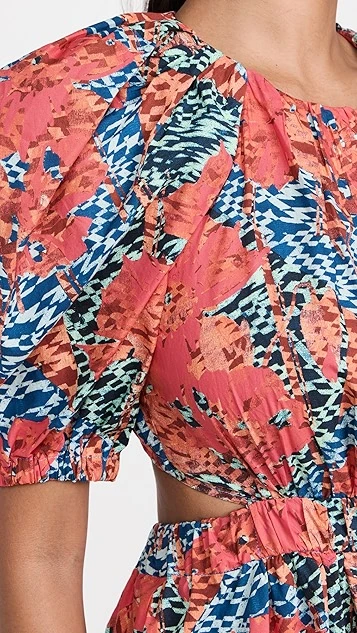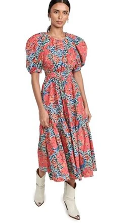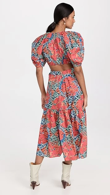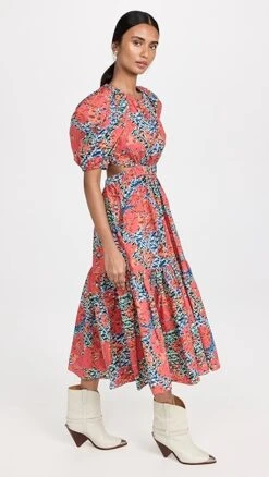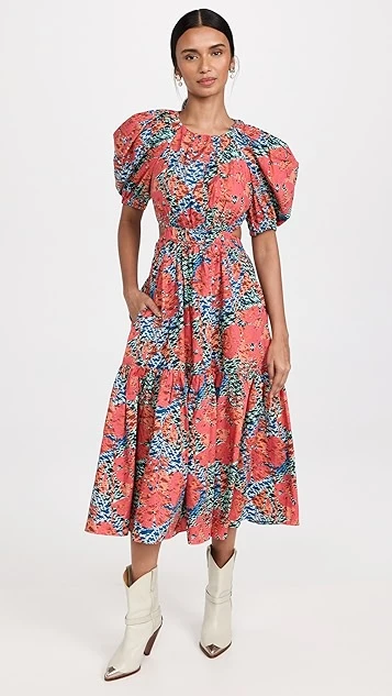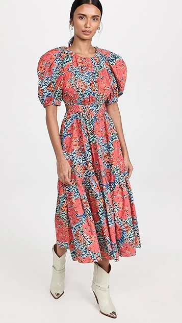 Spotlighting gently exaggerated proportions and an abstract floral pattern, this Ulla Johnson midi dress expertly balances contemporary style with a timelessly free-spirited feel. A slender back cutout brings a touch of extra allure to the silhouette. To complete your outfit, accessorize with a leather bag and drop earrings.