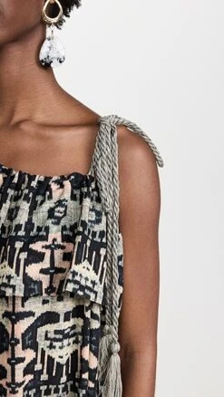 - Asymmetrical off-shoulder neckline with braided tie strap