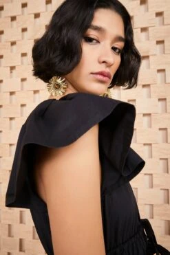 Reintroduced as part of our highly sought-after Editions Collection, the Delmara Dress is a black dress that exudes timeless elegance. Cut from our signature cotton poplin, this luxurious black dress is crafted to perfection. The bodice is gathered throughout and accentuated by a double elastic belt that highlights the nipped-in waist, giving it a sophisticated silhouette. The grosgrain ties add a luxurious touch to this ruffle dress.