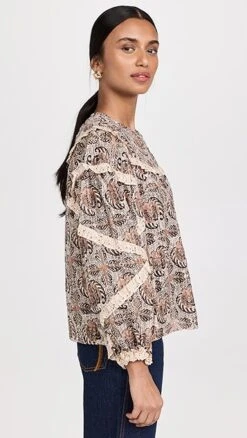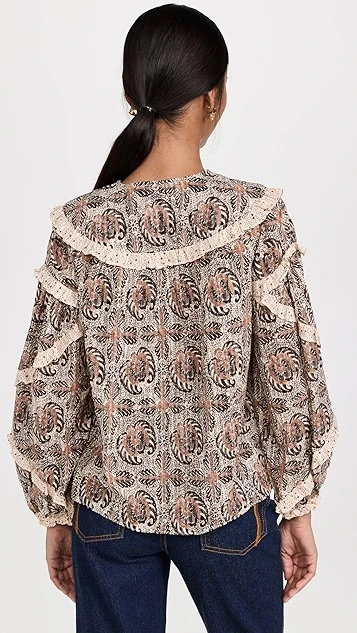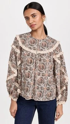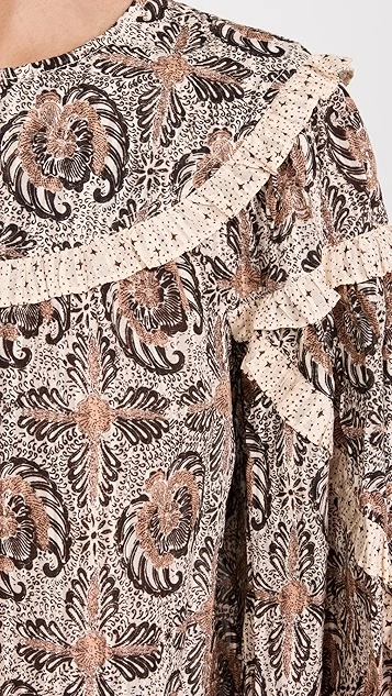 Composed of a lightweight cotton-viscose blend, this Ulla Johnson Edith blouse is instantly captivating thanks to a kaleidoscopic print. An angular arrangement of slim contrast ruffles further heightens the unique effect of the piece. We particularly like the looks of this top when it’s paired with dark denim and leather accessories.