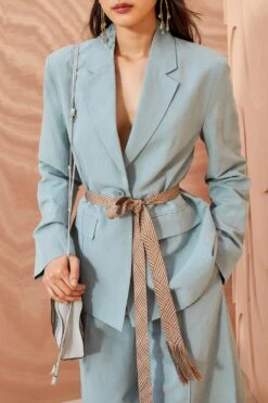 As featured in Look 36 of our Autumn/Winter ’23 Runway Show, the Ellery Jacket is crafted from our luxurious slub suiting made from a cotton, linen, and silk blend. This jacket in a delightful slate-blue is designed with a slim sleeve and has a contrast ribbon belt that creates a cinched waist.