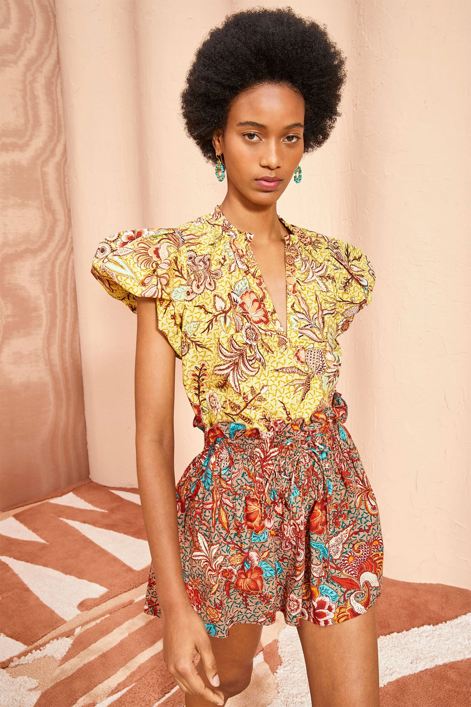The Evelyn top is crafted from our wild hibiscus printed cotton poplin, a bold floral boasting lively hues of yellow and red. This lightweight short-sleeved top features a split neckline and flutter sleeves. Pair it with the Acacia Skirt in Calla Lilly for a matching set, or mix with other monochrome or printed poplin pieces from the PF23 season for a playful look.
