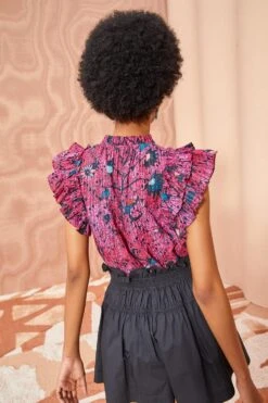 The Fleur Top is crafted from our signature shadow stripe fabric in a pink batik-inspired print. This romantic blouse features short flutter sleeves with ruffle details, a ruffled collar, and a split neckline finished with delicate ties.