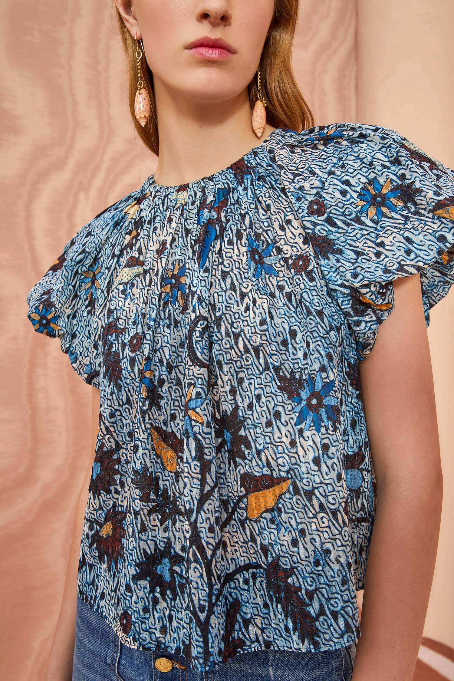 The Flo Top is crafted from our signature cotton shadow stripe in a light blue batik-inspired floral motif print. This effortless blouse features puff sleeves and a round collar. Finished with a sweet ribbon tie in the back.