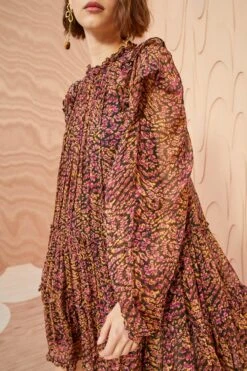 The Gaelle Dress is made from luxurious silk crinkled chiffon that’s micro-painted with a lovely brown and pink leopard print. This mini dress features gently puffed sleeves, curling ruffle trims, and a removable tie belt for a cinched look. It is finished with a back button keyhole closure.