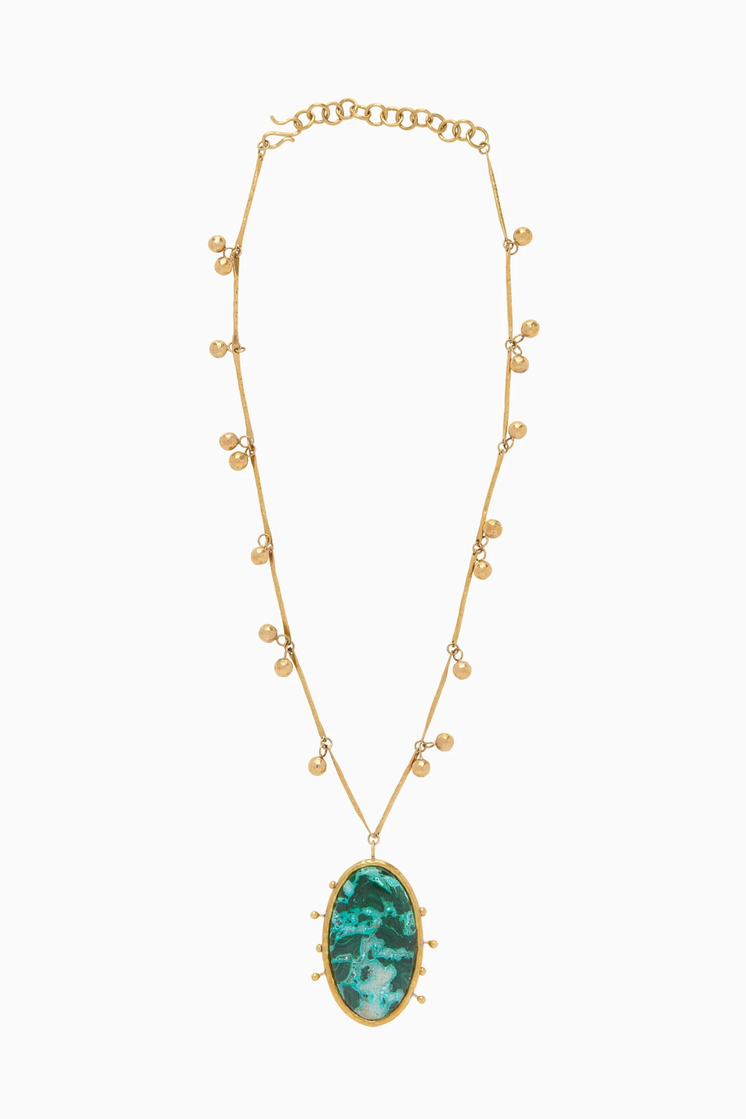 A standout future heirloom, the Hammered Chain Organic Stone Pendant is crafted by our longtime artisan partners in Nairobi. It is made from lustrous brass that’s hammered by hand and set with a turquoise pendant–the vibrant blue patterns of which are unique to each stone.