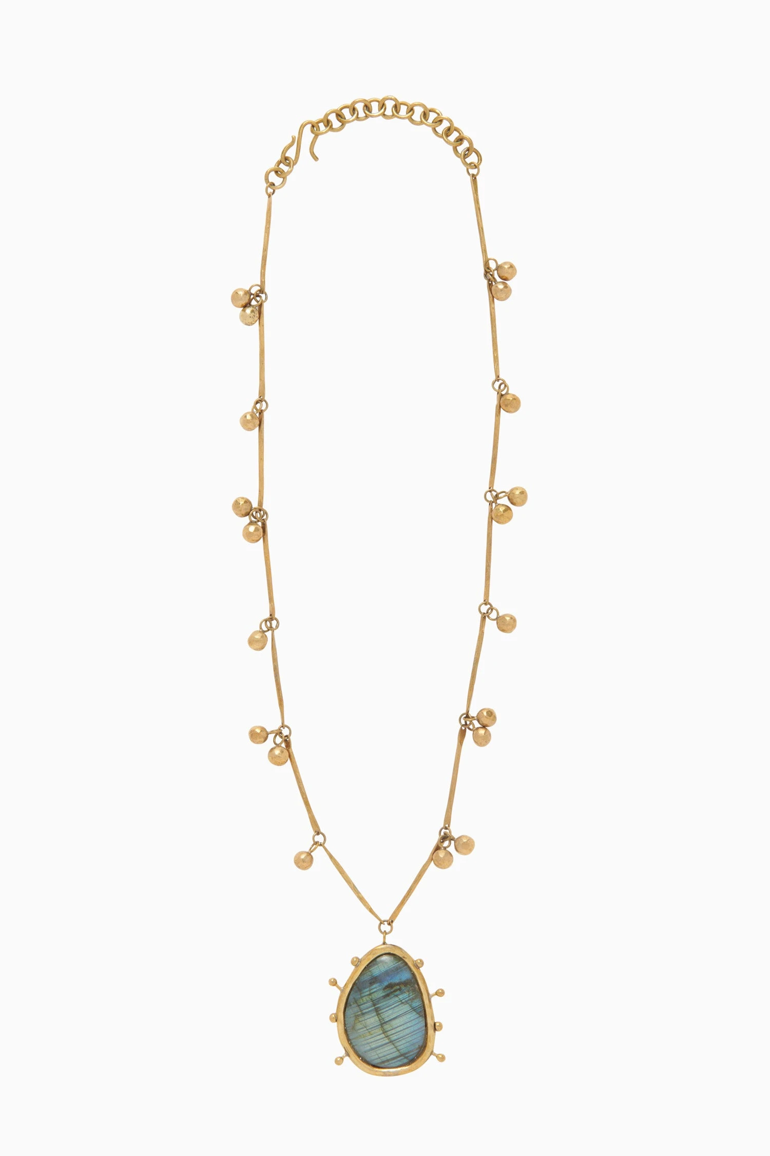 The Hammered Textured Organic Stone Necklace is handcrafted in Kenya by our longtime artisan partners using recycled brass and an exquisite labradorite gemstone pendant. Inspired by organic shapes found in nature, this necklace is detailed with round bobbles along the chain and finished with an adjustable S-clasp closure.