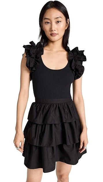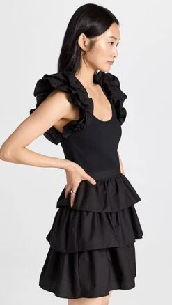 Go from day-to-night with easy in this mixed-media little black dress from Ulla Johnson. This piece juxtaposes a slim bodice in ribbed jersey with a tiered skirt and shoulder ruffles in crisp poplin. Complete your outfit with the heeled sandals of your choice.
