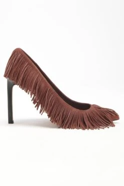 As featured in Look 38 and 50 of our Autumn/Winter ’23 Runway Show, the Inez Fringe High Heel is designed with our new straight heel shape that is 95mm tall. This lovely red auburn shoe is wearable while maintaining intrigue with fine suede fringe along the topline of the shoe opening.