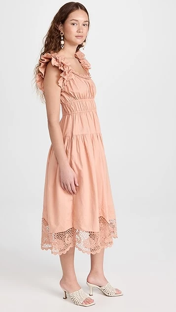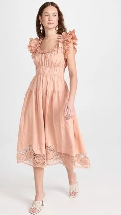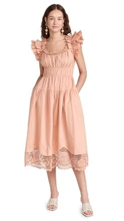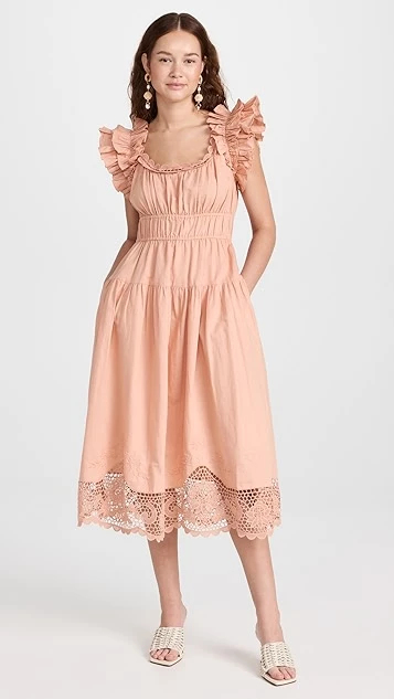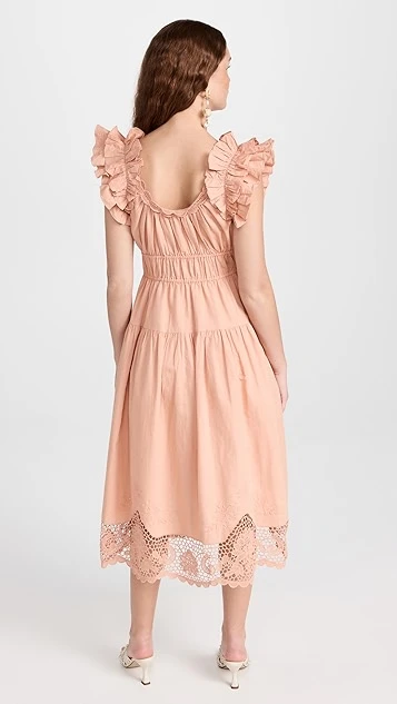 Ulla Johnson’s flair for the romantic is on display with this lightly colored midi dress. This silhouette is embellished with lots of dreamy details you’ll fall for, like ruffly shoulders, tidy pleats throughout the silhouette, and a tonal hem in delicate lace.
