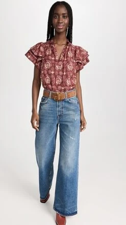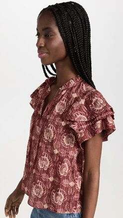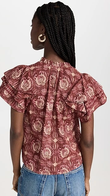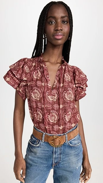 Fresh from the label’s Pre-Spring ’23 collection, this Ulla Johnson Lilli top features intricate patterning and an earth-tone shade of red. Layered ruffles lend definition to the shoulders. Lean into the free-spirited feel of this piece by pairing it with high-rise jeans, or opt for a skirt from the brand’s assortment.