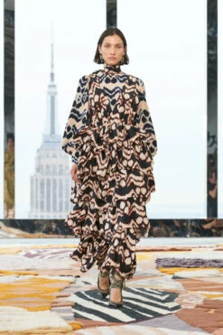 As featured in Look 35 of our Autumn/Winter ’23 Runway Show, the Lilliana Blouse is made from luxurious satin back crepe which features a beautiful, flowing drape. This vivid blue and peach blouse has an airy bodice and voluminous sleeves finished with buttoned cuffs. It is finished with a center-back zipper.