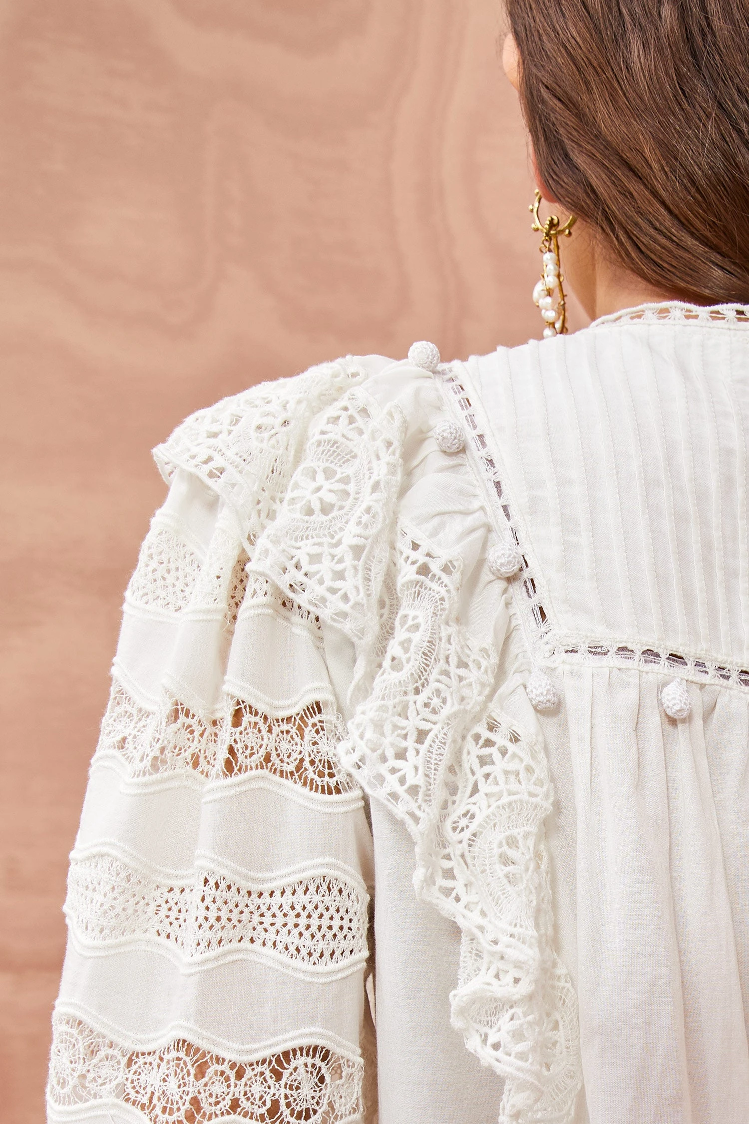 Making a stunning return for the season, The Lily Blouse is an Ulla Johnson favorite reimagined. This lacy white blouse features loose sleeves with intricate buttoned cuffs, ruffle details and a bobble-trim hemline. This effortless top is unlined to allow skin to peek through the intricate perforations and is finished with a back-button closure.
