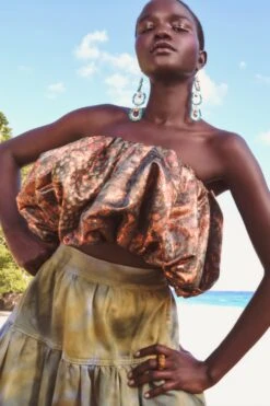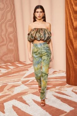 As featured in Look 16 of our Pre-Fall ’23 Lookbook, the strapless Lyla Top is made from our luxurious lurex jacquard fabric. This special textile is made in Italy and features soft colorations in a woodland-inspired pattern with flecks of metallic lurex that catch the light. The cropped bubble-hem top is finished with an underlay corset and a side-seam zipper. Style with our Dafne Trousers for a matching look.Â