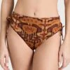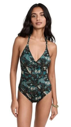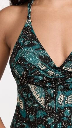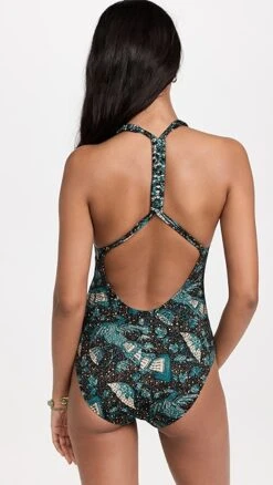 A stylish Ulla Johnson Madeira one-piece swimsuit, featuring a vivid pattern, a slim racer back, and a touch of ruching at the neckline.