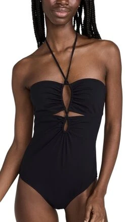 A minimalist rendition of Ulla Johnson’s signature Minorca one-piece halter swimsuit, rendered in black fabric and accented with cutouts and gathering at the center.