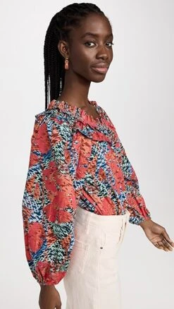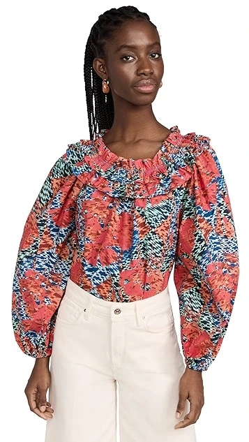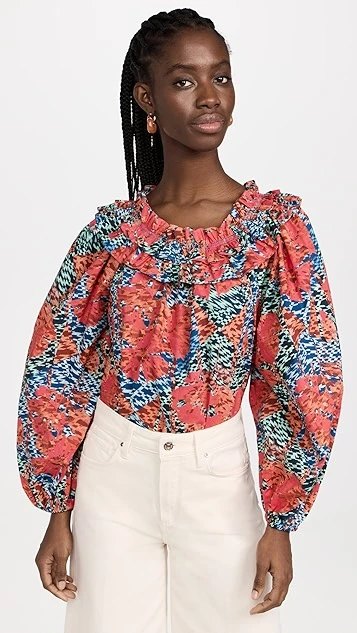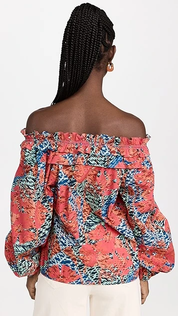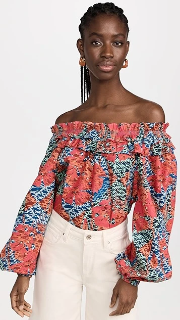 Ulla Johnson’s love of vivid prints and voluminous proportions shines through with this off-shoulder blouse. This top is crafted from lightweight, pure-cotton fabric, and works particularly well when it’s tucked into a monochrome pair of high-rise jeans.