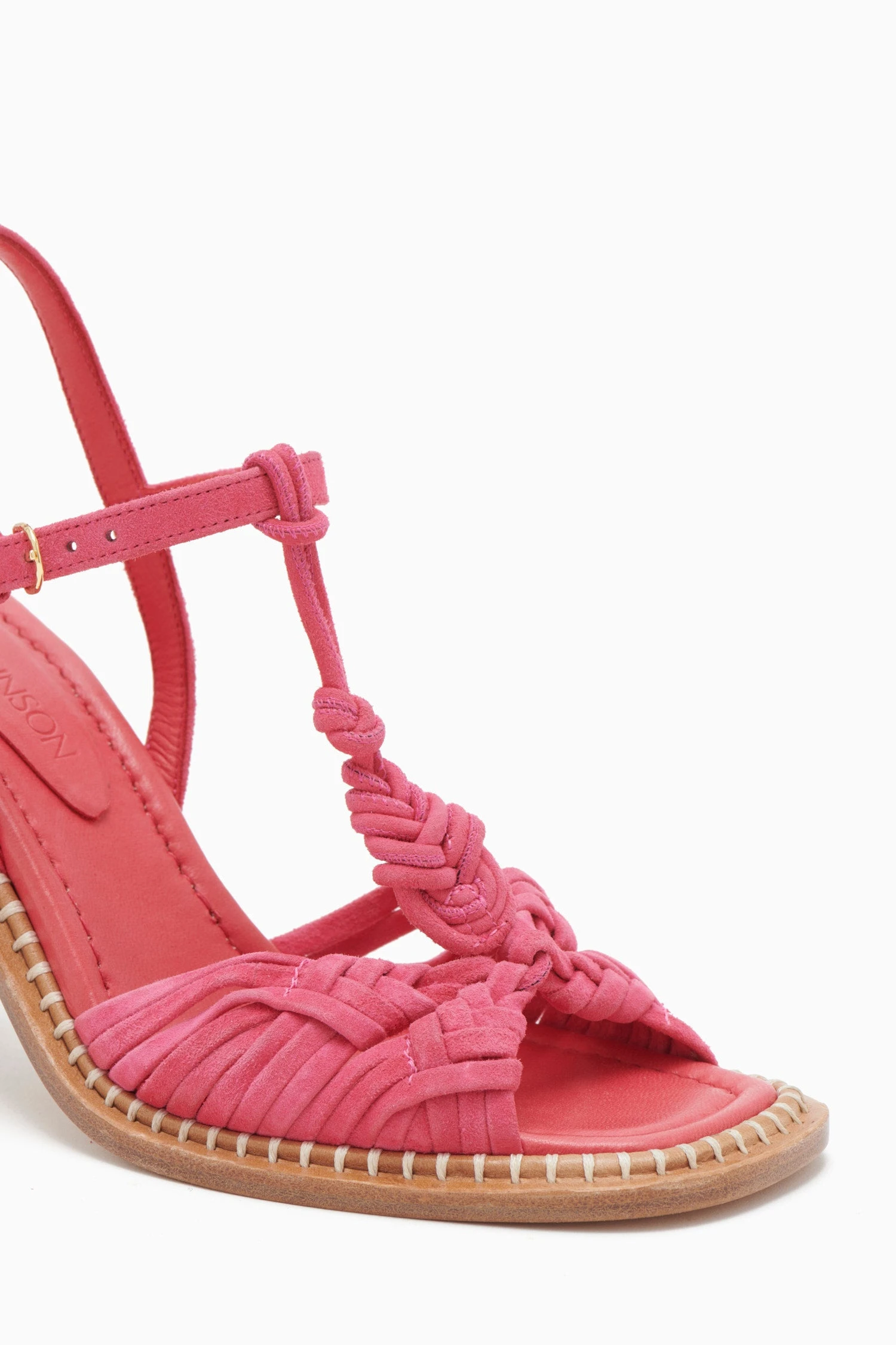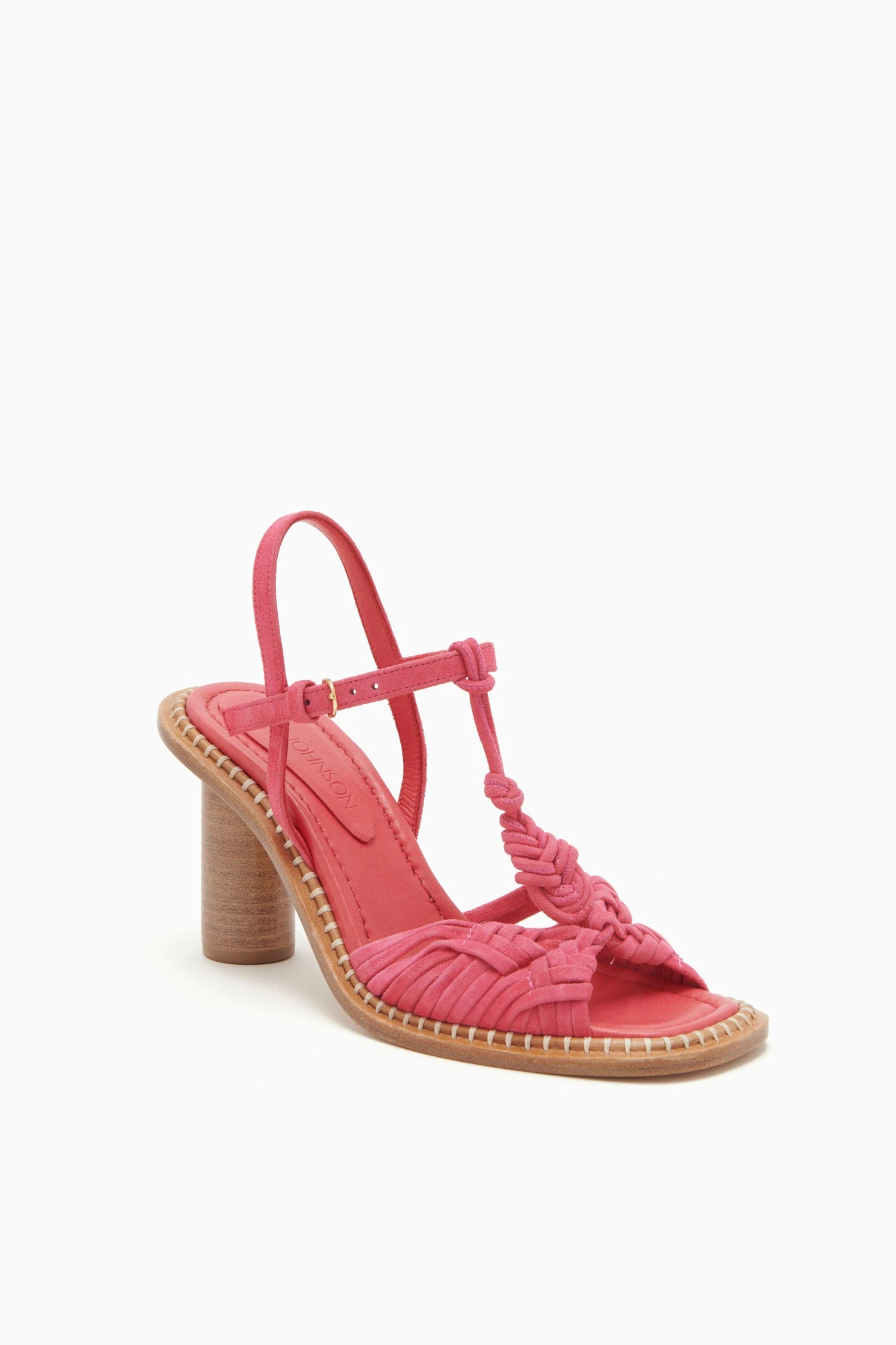 The Penina Macrame Braided High Heel is made of hot pink leather and features soft braided suede that creates a delicate macramé-inspired design. This open-toed silhouette is elegantly elevated by a stacked cylinder heel and finished with a shiny brass buckle.