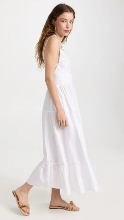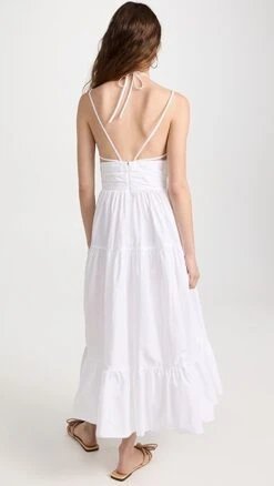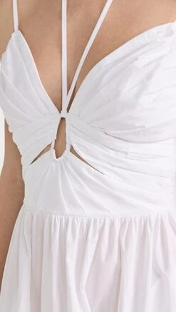 A polished Ulla Johnson fit and flare dress, ready for warm-weather occasions in bright white poplin. A mix of halter and shoulder straps brings a subtly unique feel to the silhouette. Round out your look with flat sandals, and accessorize with gold earrings.