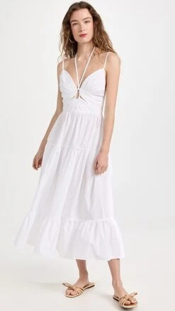 A polished Ulla Johnson fit and flare dress, ready for warm-weather occasions in bright white poplin. A mix of halter and shoulder straps brings a subtly unique feel to the silhouette. Round out your look with flat sandals, and accessorize with gold earrings.
