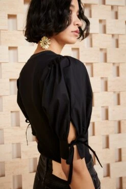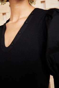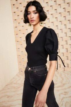 The forever favorite Pia Top is made from our favorite ribbed cotton with contrasting crisp cotton poplin sleeves. Pair it with our Wade Jean for a crisp and tailored look. Short sleeve style featuring cotton poplin balloon sleeves and a deep v-neckline.