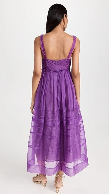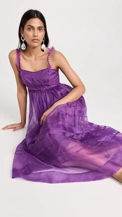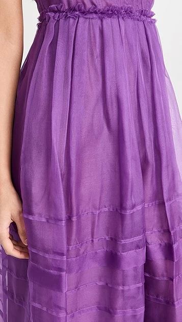 - Pleated skirt and ruffle trim with raw edges