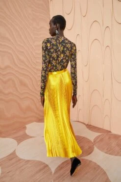 As featured in Look 30 of our Autumn/Winter ’23 Runway Show, the Rami Skirt is made from pleated satin in a saturated hue of sunsprite yellow. This lustrous skirt expands and contracts with movement, and has a fixed waist and a midi-length hem.