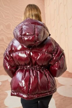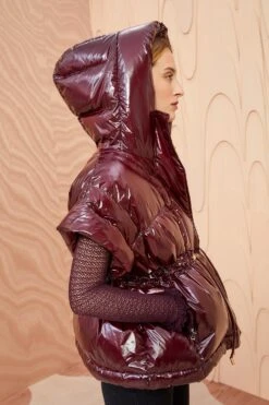 A balance between luxury and the sportif, our Rhodes Jacket is crafted from lacquered nylon with a down filling for maximum warmth and is a beautiful mahogany hue. This hooded puffer silhouette features long sleeves that you can remove to create an entirely new silhouette, and a drawstring waist for a cinched look. It fastens with zip and snap button closures.