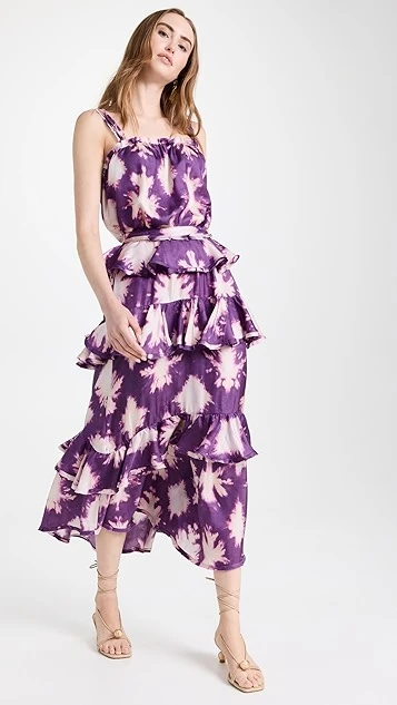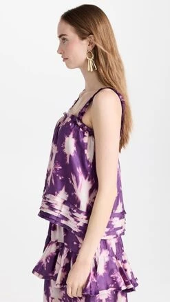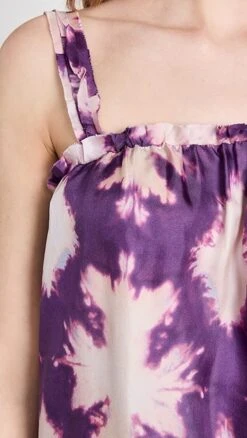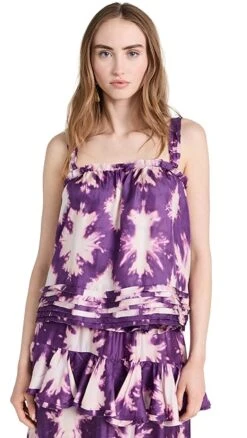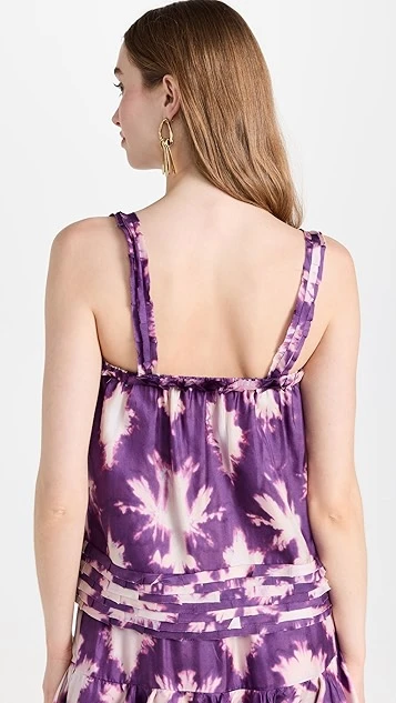 A sleeveless Ulla Johnson top in pure silk, detailed with splashy tie dye patterning and designed with a precise arrangement of tiers at the hem.
