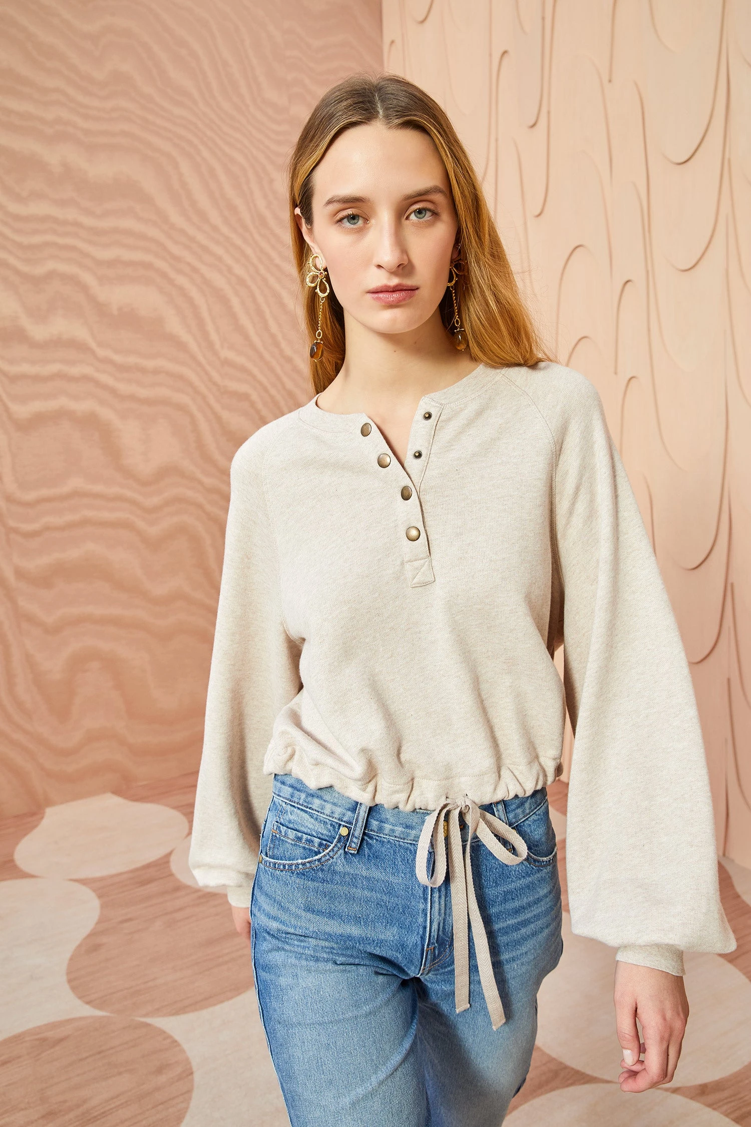Elegance meets the sportif in our Tess Pullover. Made from ultra-soft fleece with bamboo and organic cotton, this cream-hued style has gently puffed long sleeves and a drawstring hem you can cinch to your liking. It is finished with golden snap buttons along the front.