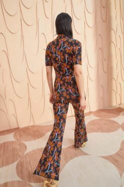 As featured in Look 37 of our Autumn/Winter ’23 Runway Show, the Zena Pant is made from a blend of merino wool and cotton in a textured jacquard pattern with swirling orange, brown, and pink botanicals. These ’70s-inspired pants sit high at the waist and feature flared legs.