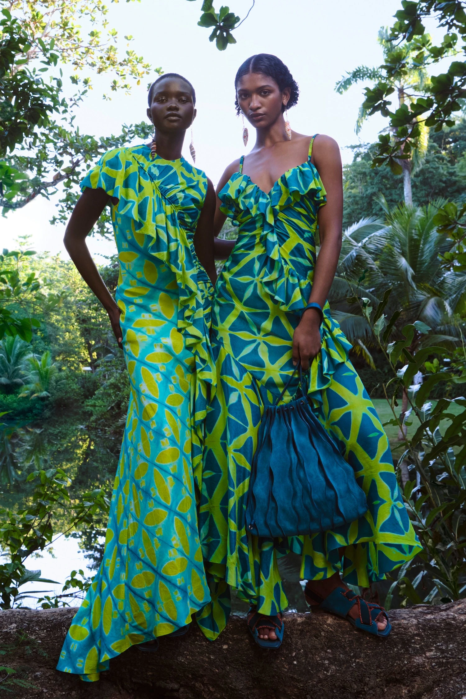 As featured in Look 34 of our Pre-Fall ’23 Lookbook, the Zoya Dress is handcrafted by a collective of women in Bangalore using an intricate technique known as clamp dyeing that creates beautifully prismatic patterns in vibrant blue and green hues. No two pieces are alike. This exquisite midi dress has a ruched bodice detailed with ruffles along the neckline that cascade into the skirt. It is finished with a side-seam zipper closure.
